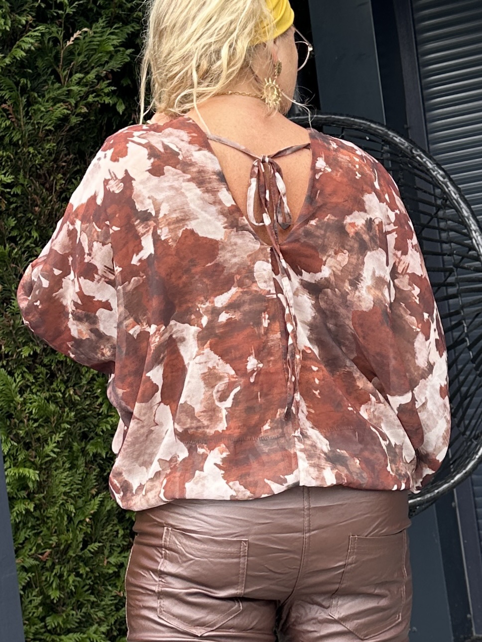 Une blouse légère et élégante aux couleurs chaudes (mélange de marron, rouille et beige) qui sublime toutes les carnations.