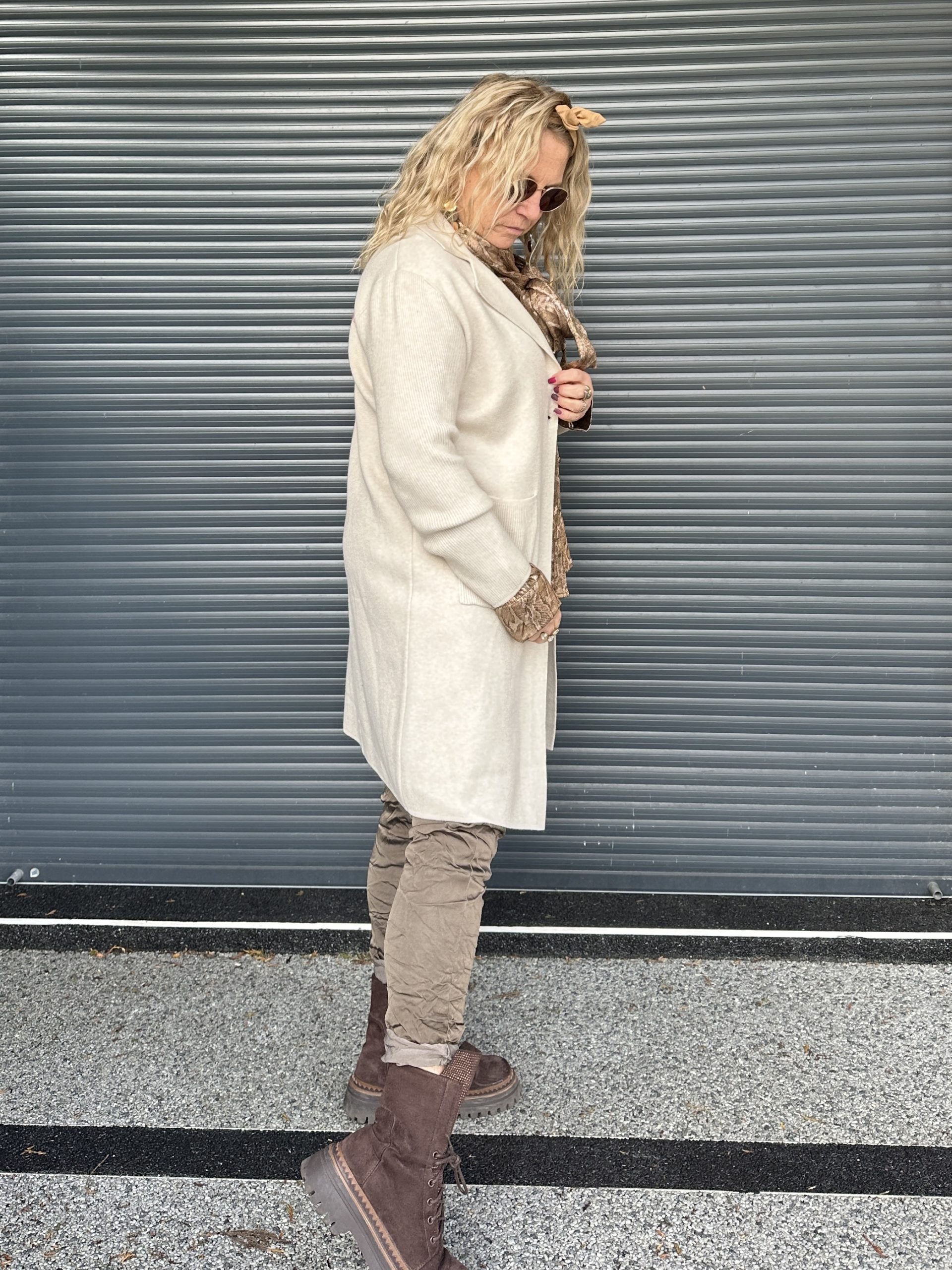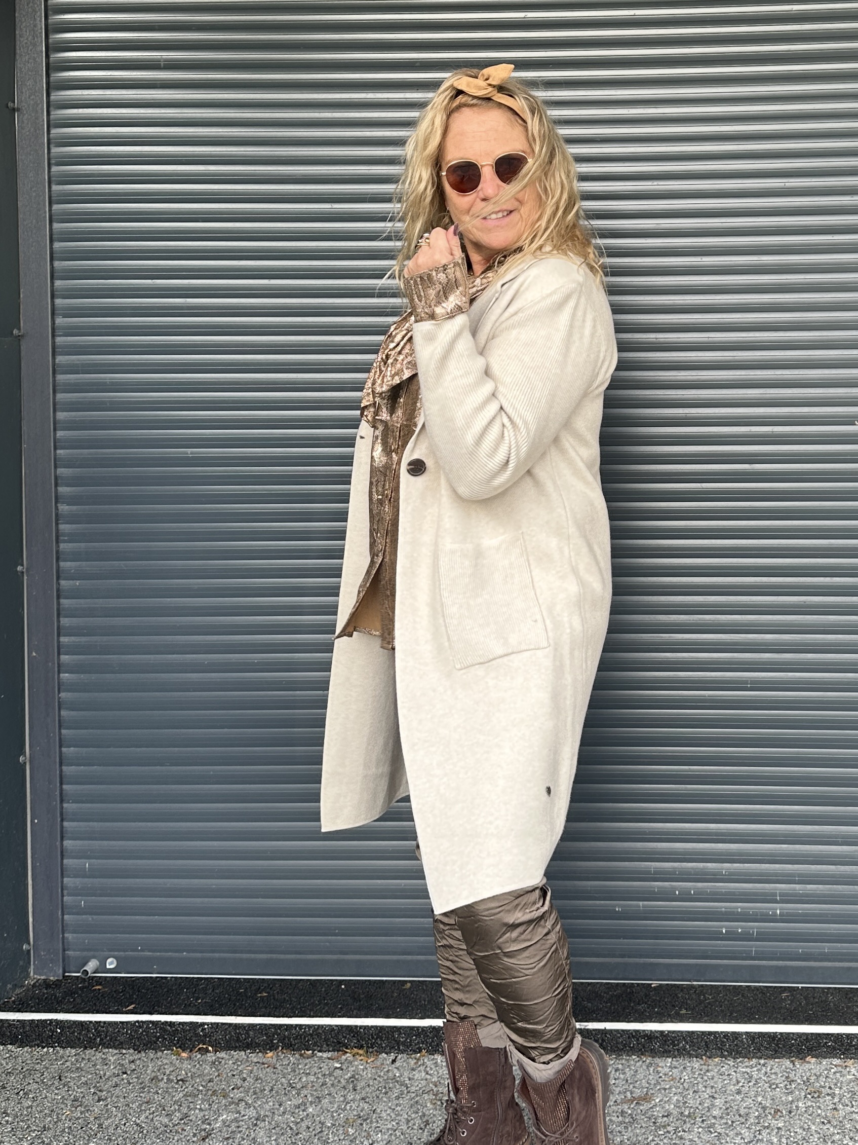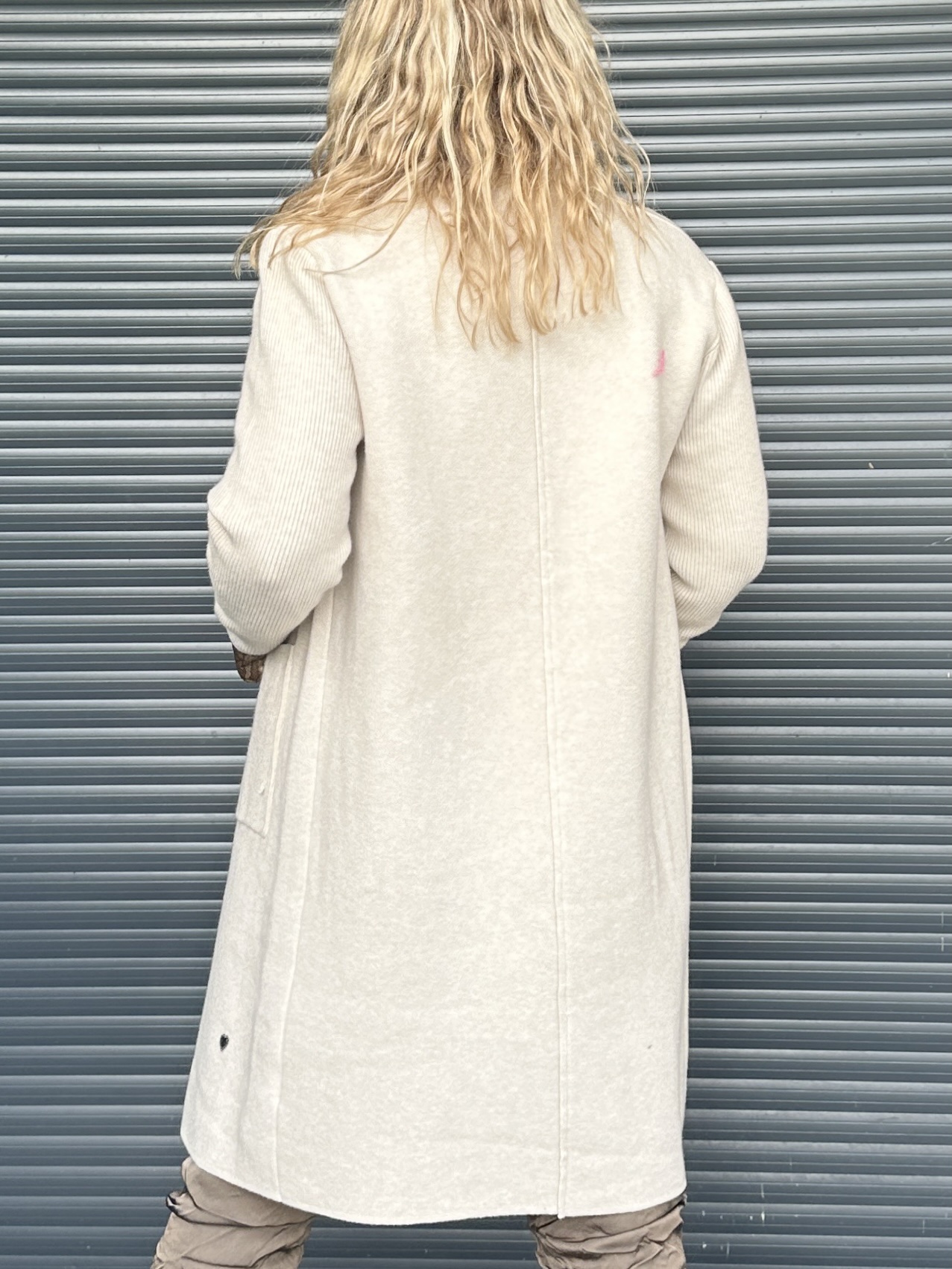 Sa matière douce et chaleureuse est idéale pour la saison, tout en restant légère et agréable à porter. On adore sa coupe longue qui allonge la silhouette, ainsi que ses manches en maille côtelée qui apportent une touche moderne et raffinée.