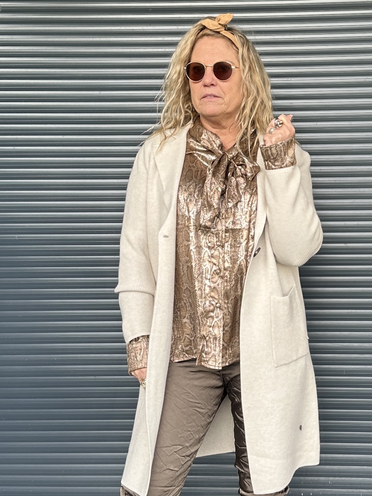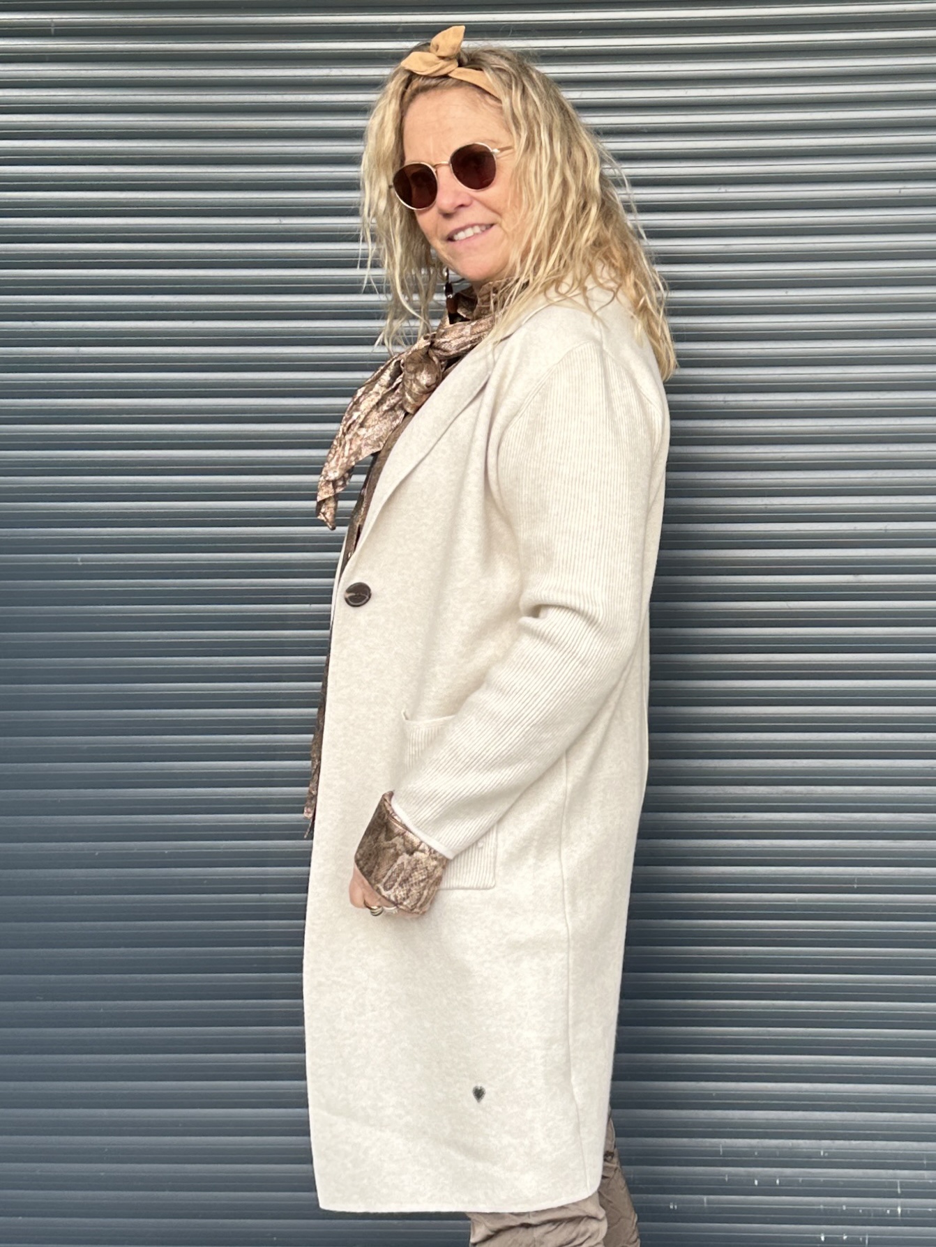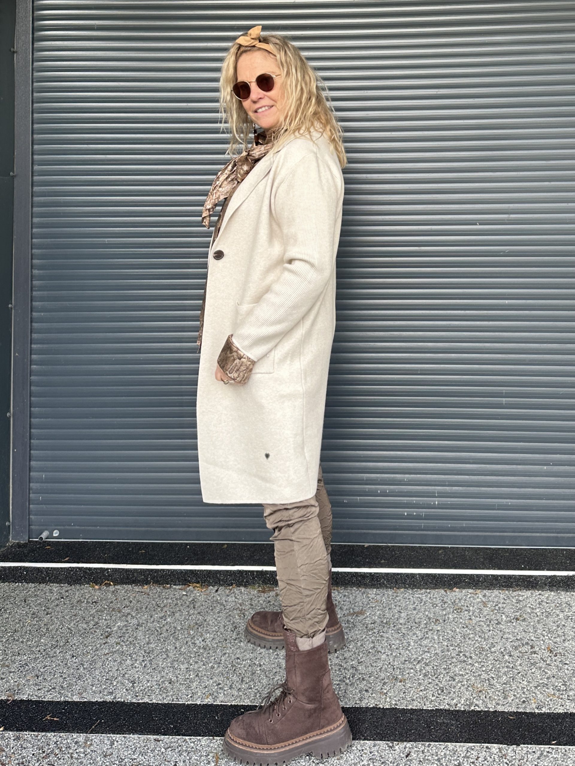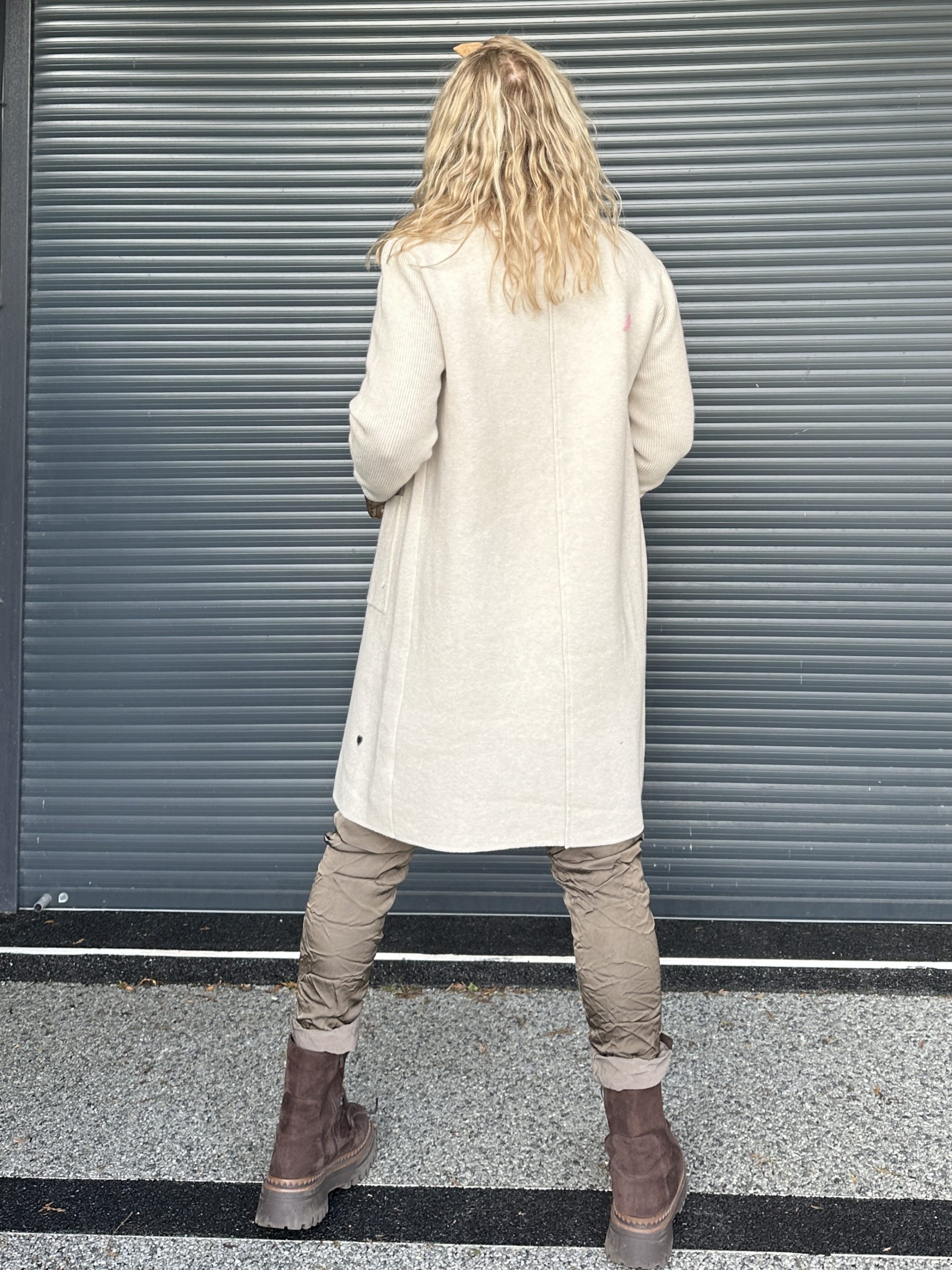 Sa matière douce et chaleureuse est idéale pour la saison, tout en restant légère et agréable à porter. On adore sa coupe longue qui allonge la silhouette, ainsi que ses manches en maille côtelée qui apportent une touche moderne et raffinée.
