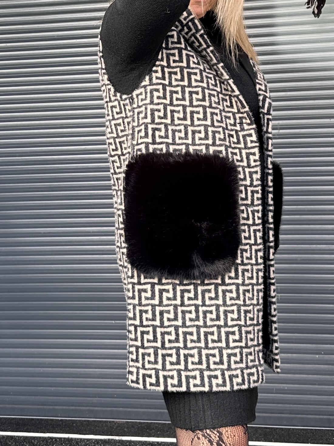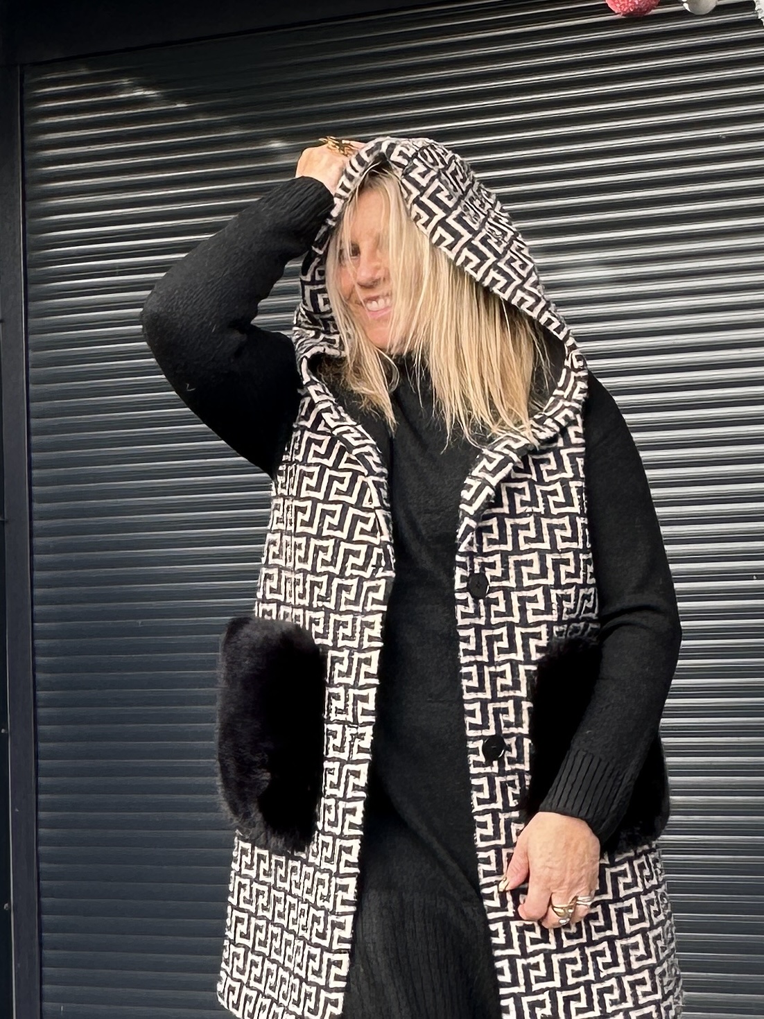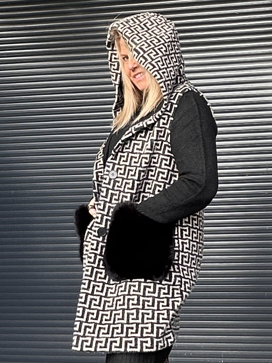 Son imprimé graphique apporte une touche moderne et tendance, tandis que la capuche renforce son esprit cocoon. Les grandes poches plaquées sur le devant, doublées effet fourrure, ajoutent à la fois du style et du confort.