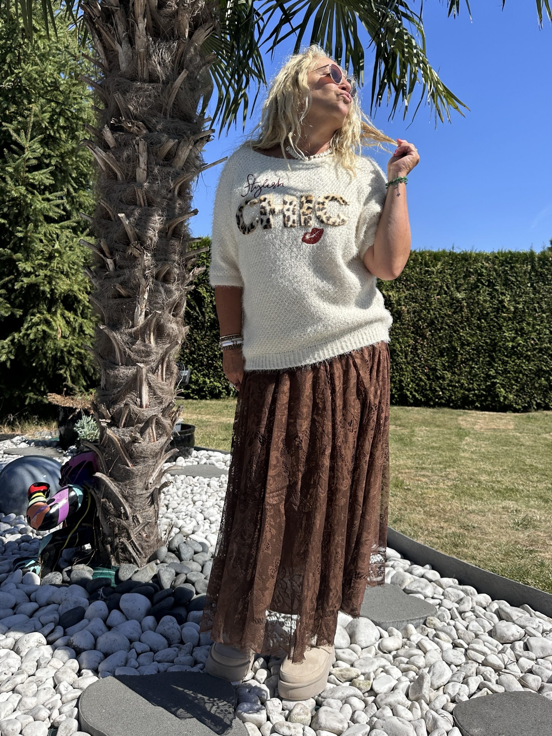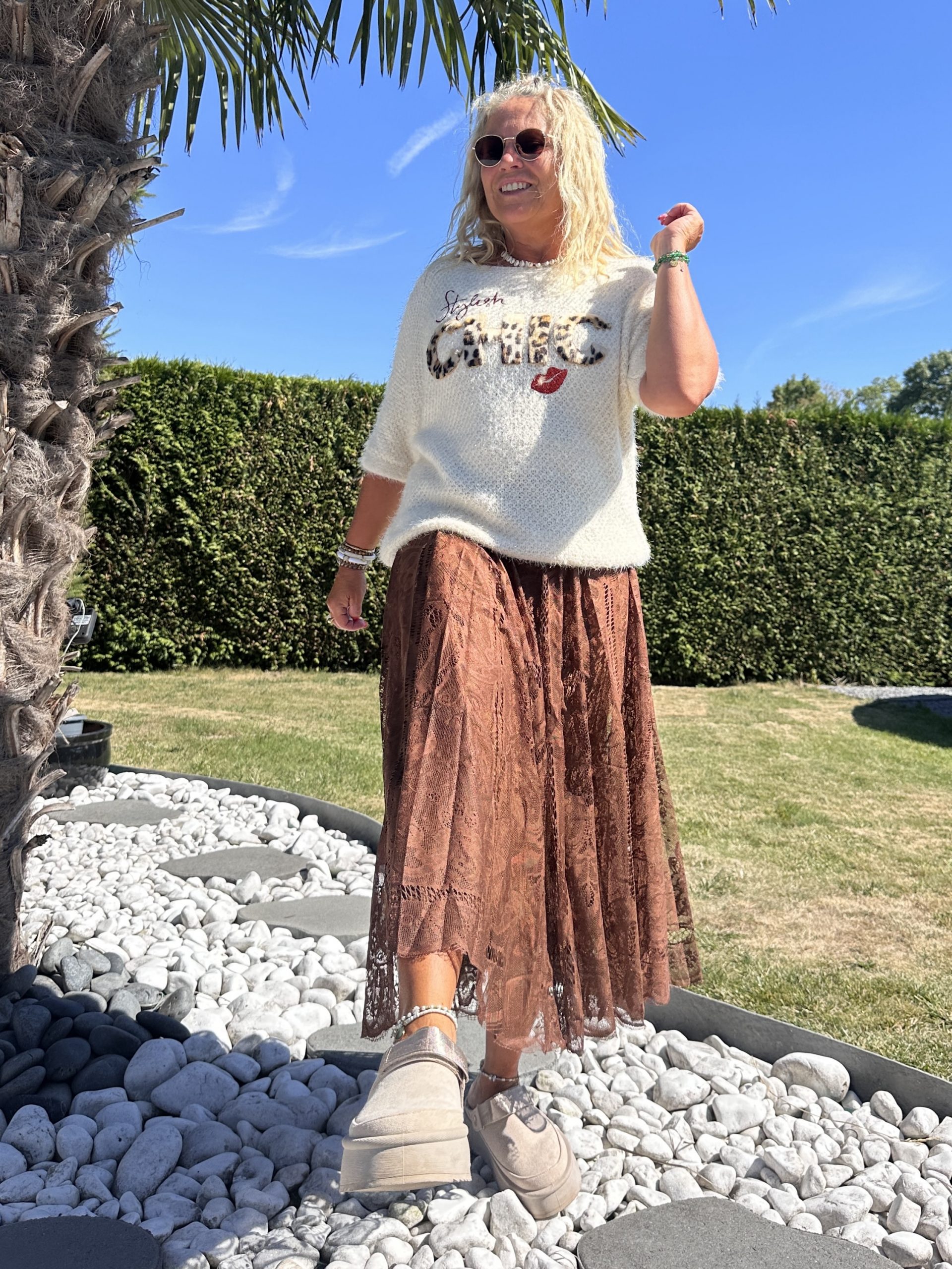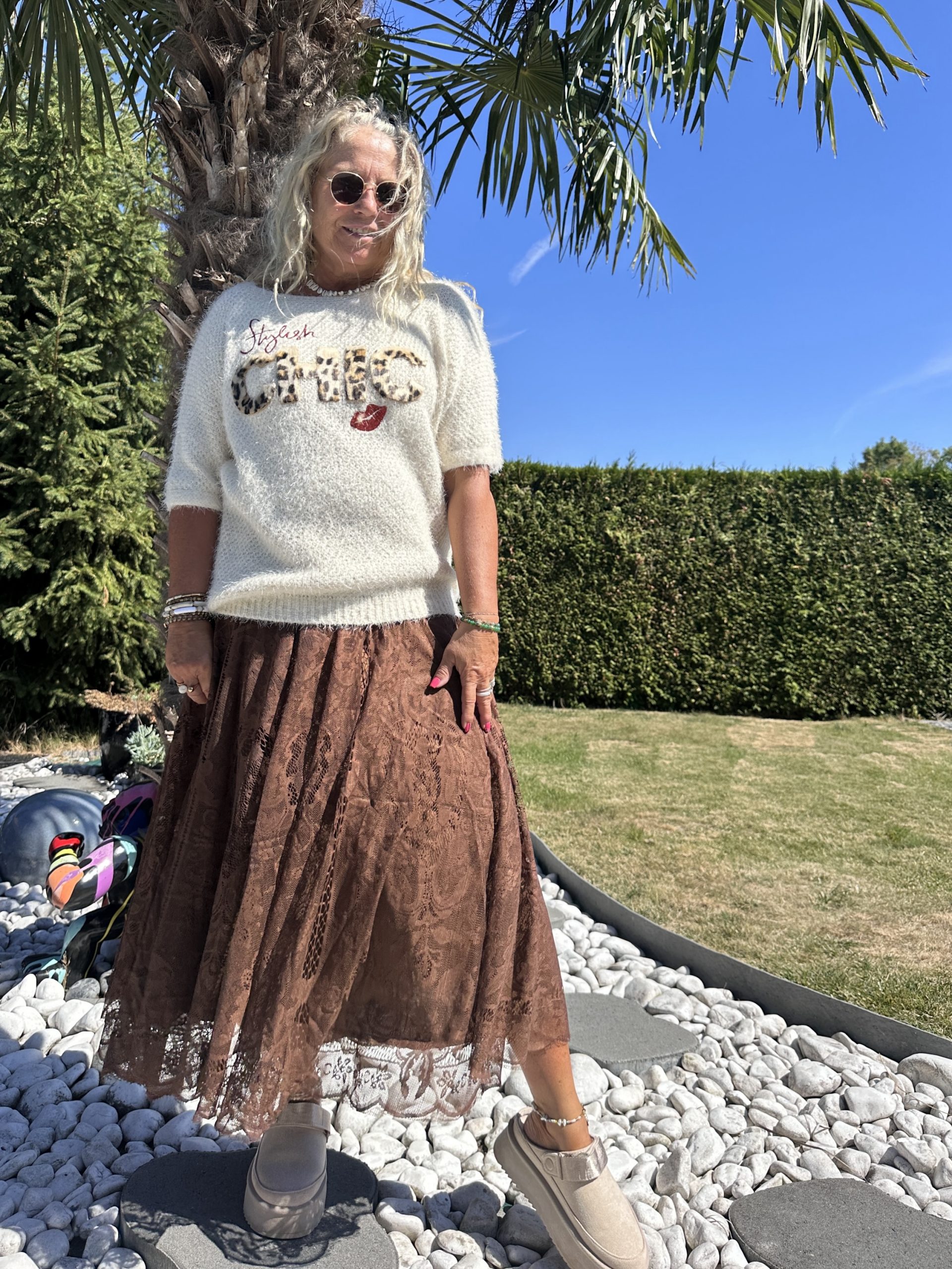 Féminine et élégante, cette jupe longue en dentelle offre un style raffiné avec sa doublure fluide. Sa taille élastique assure confort et maintien tout au long de la journée.