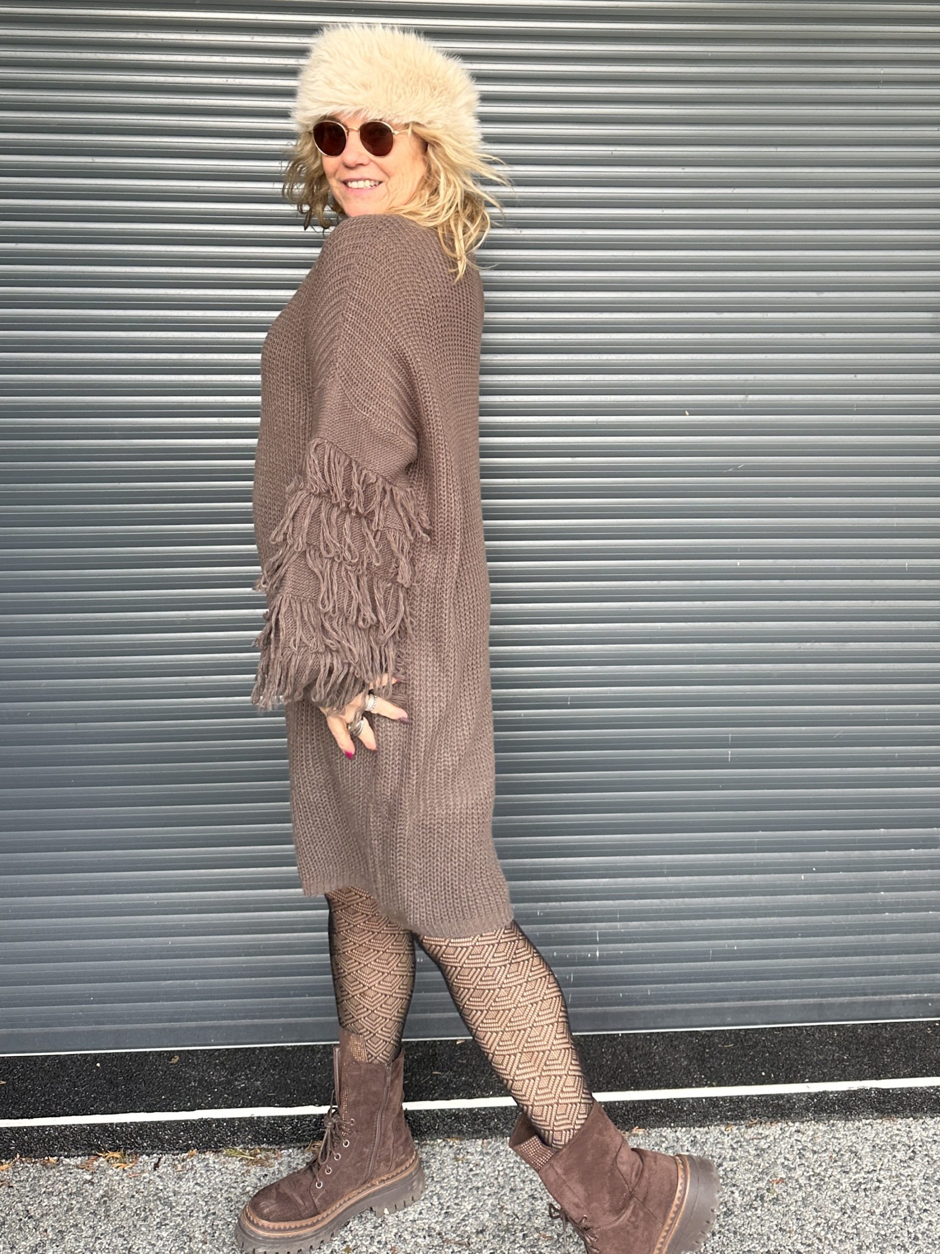 Robe pull en maille extensible, douce et agréable à porter. Sa coupe droite et confortable offre un tombé fluide sans marquer la silhouette. Les franges sur les manches apportent une touche bohème et originale.