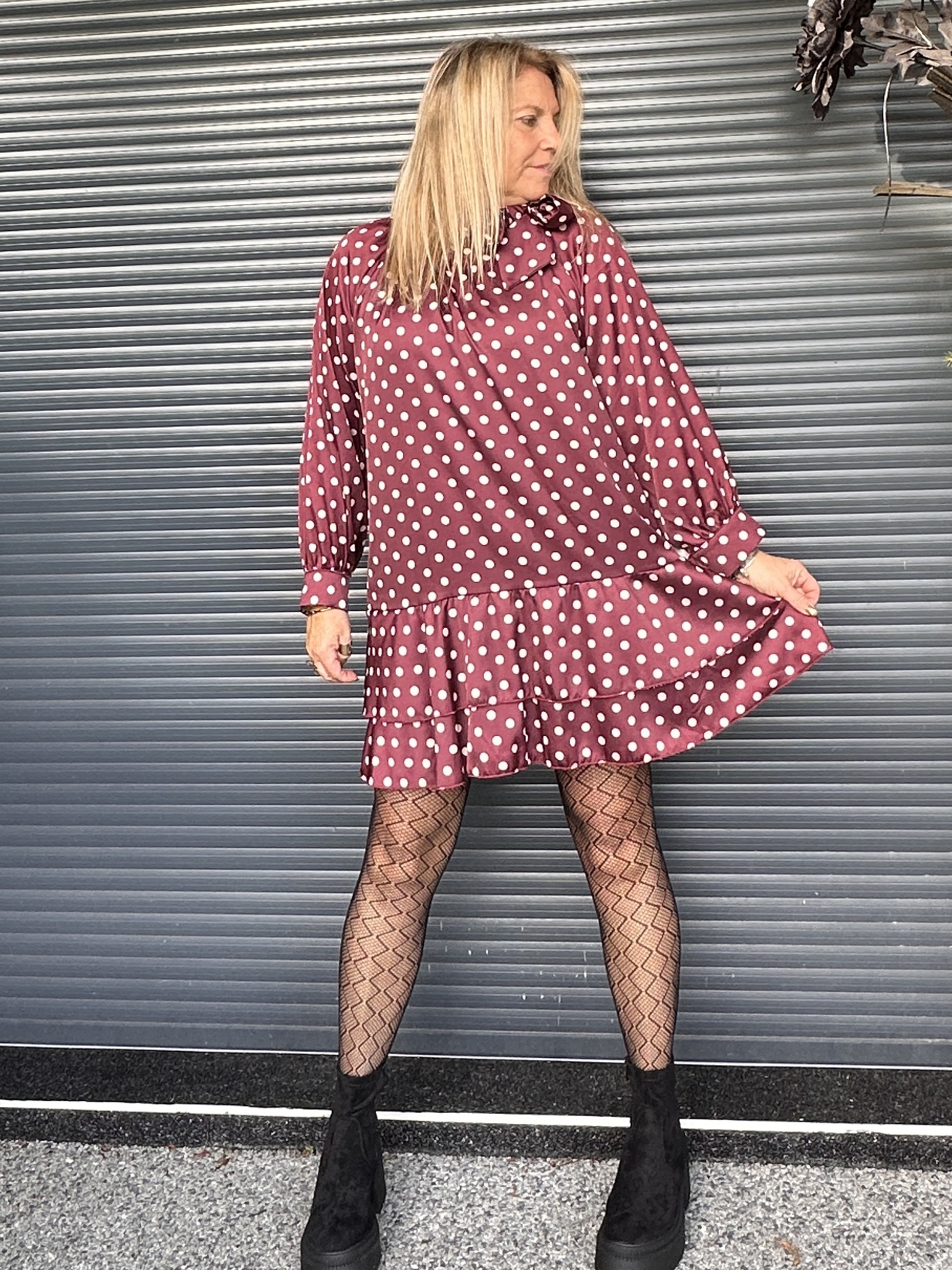 Craquez pour cette robe élégante et féminine au tissu satiné fluide, sublimée par un imprimé à pois intemporel. Son coloris bordeaux profond apporte une touche chic et chaleureuse, parfaite pour la saison.