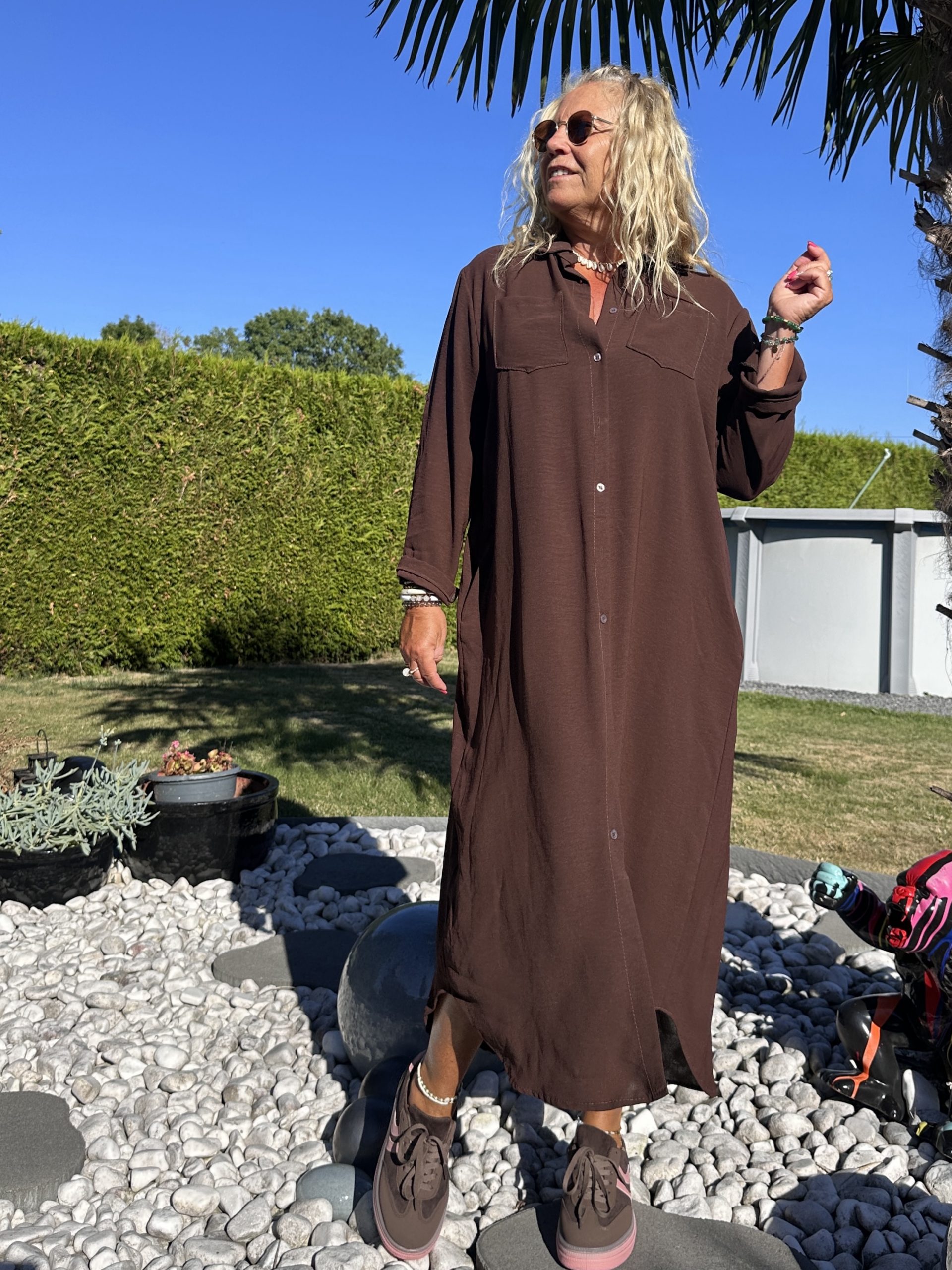 Une coupe fluide et élégante, avec poches poitrine et boutonnage sur toute la longueur pour un style tendance et confortable. Peut se porter ouverte en surchemise ou fermée en robe.